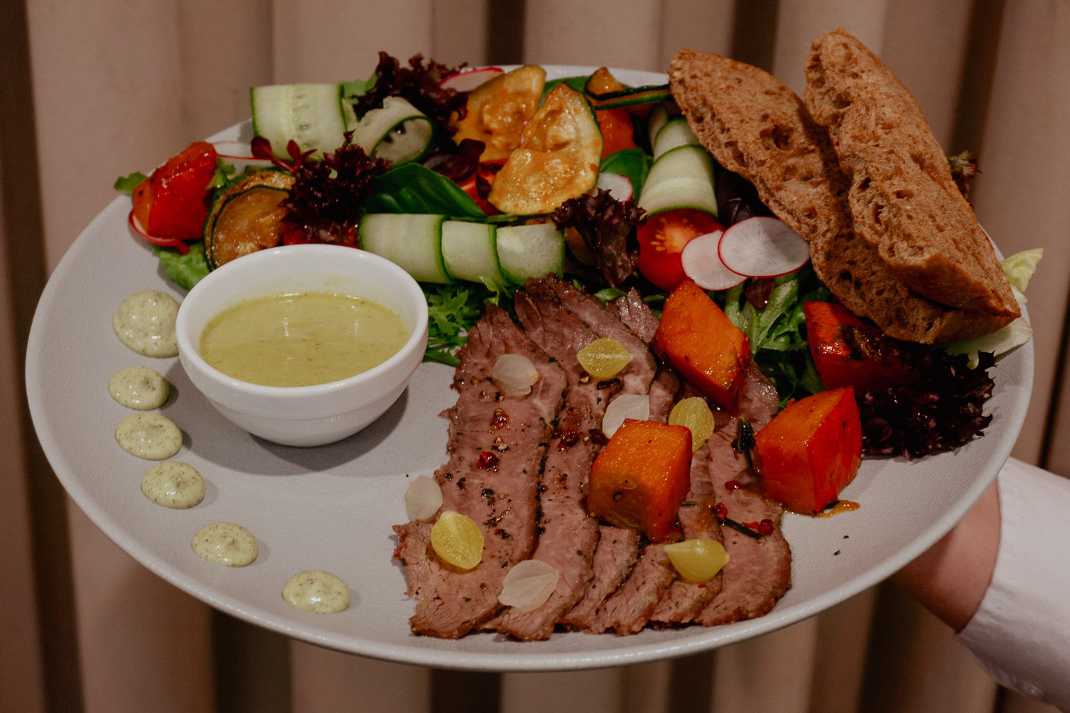 Sałatkę z rostbefem podawaną w towrzystwie grillowanej cukini, sosu jalapeno, majonezu wasabi z bułką schiaciattą