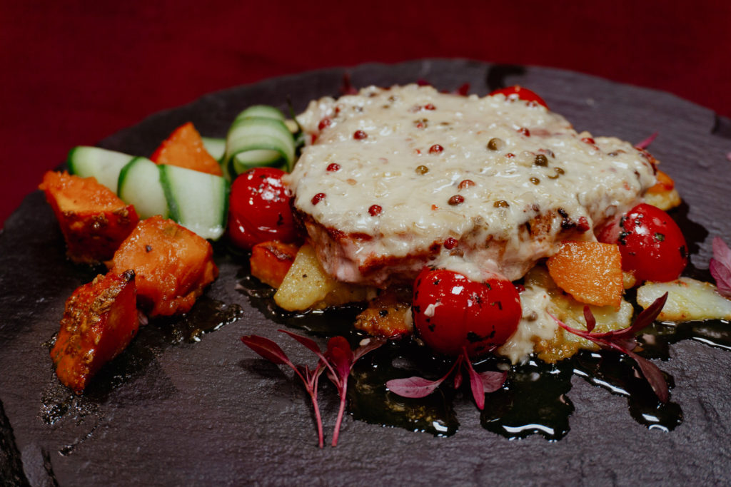 Stek z tuńczyka podawany z sosem pieprzowym, dynią marynowaną w miodzie, gratin ziemniaczanym i pomidorami z czosnkiem niedźwiedzim