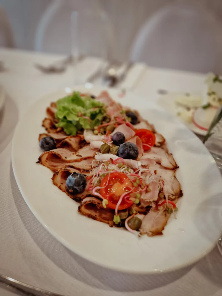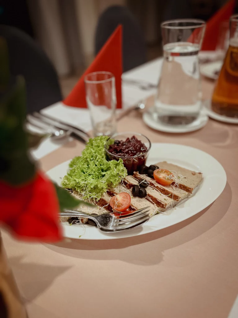 Na stole znajdziesz także sałatkę jarzynową – klasykę, bez której trudno wyobrazić sobie polską wigilię. Obok niej soczyste i pachnące przyprawami pasztety i pieczone mięsa, przygotowywane przez naszych kucharzy w restauracyjnej kuchni.
