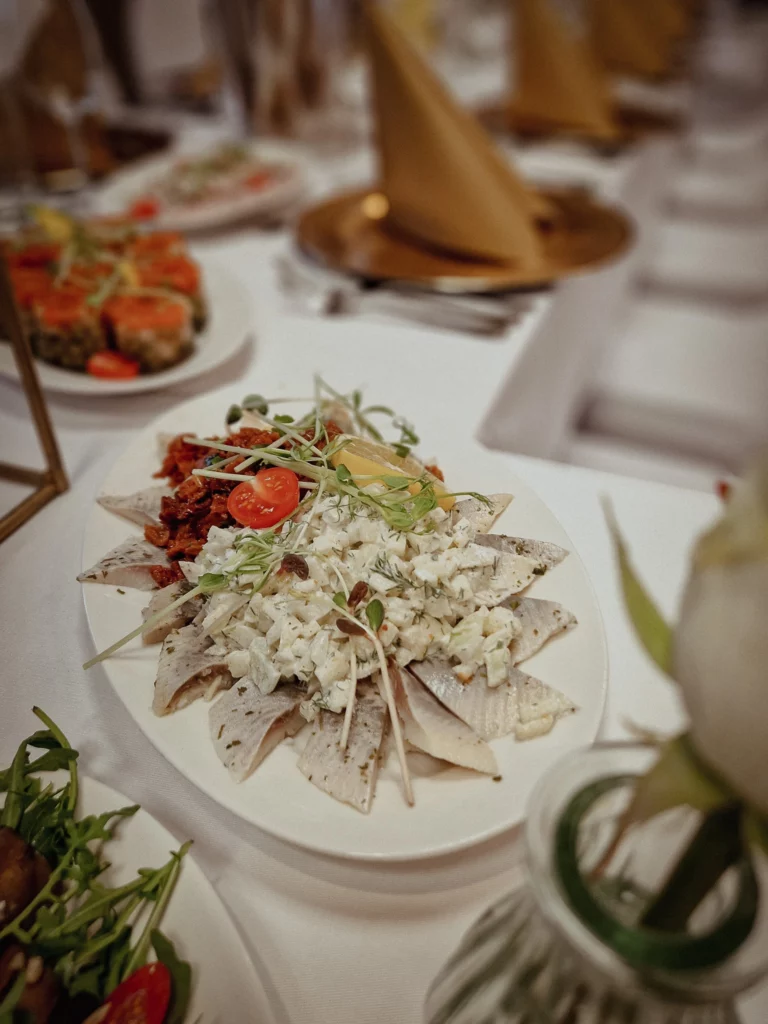 W cateringu wigilijnym nie może zabraknąć ryb. Oferujemy tradycyjne śledzie z cebulką, marynowane tak, by łączyły słony smak ryby z delikatną słodyczą cebuli. Dla osób, które lubią odrobinę nowoczesności, przygotowujemy również warianty inspirowane kuchnią śródziemnomorską oraz europejską, a także eleganckie przekąski, jak roladki i sałatki z łososiem czy mini tatary rybne.